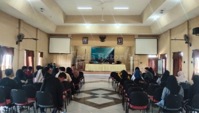 SERIUS: Pengurus dan anggota HMP PGSD saat mengikuti pembukaan Mubes V di Auditorium kampus setempat, pada Rabu (18/10/23). (Iqbal/mediaretorika.com).