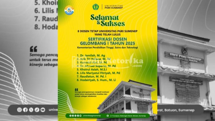 Poster ucapan selamat atas kelulusan delapan dosen Universitas PGRI Sumenep pada Sertifikasi Dosen (Serdos) Gelombang I Tahun 2025.