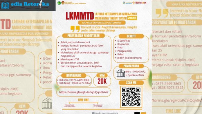 MEDIARETORIKA.com–Himpunan Mahasiswa Prodi (HMP) Pendidikan Jasmani Kesehatan dan Rekreasi (PJKR) Universitas PGRI (UPI) Sumenep membuka pendaftaran Latihan Keterampilan Manajemen Mahasiswa Tingkat Dasar (LKMMTD) sejak 18-30 September.
