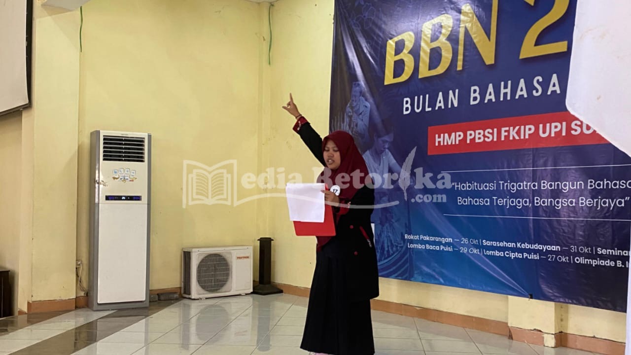 BERSAJAK: Salah satu peserta tengah membacakan puisinya pada Lomba Baca Puisi Bulan Bahasa Nasional (BBN) 2025 HMP PBSI FKIP UPI Sumenep (Dok. BBN 2025 untuk Mediaretorika.com) Selasa (29/10/25).