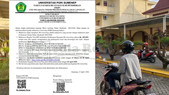 MEDIARETORIKA.com–Pelaksanaan kegiatan microteaching di Universitas PGRI (UPI) Sumenep yang akan berlangsung pada Senin (20/04/26) mendatang, menuai sorotan dari kalangan mahasiswa.