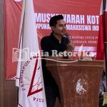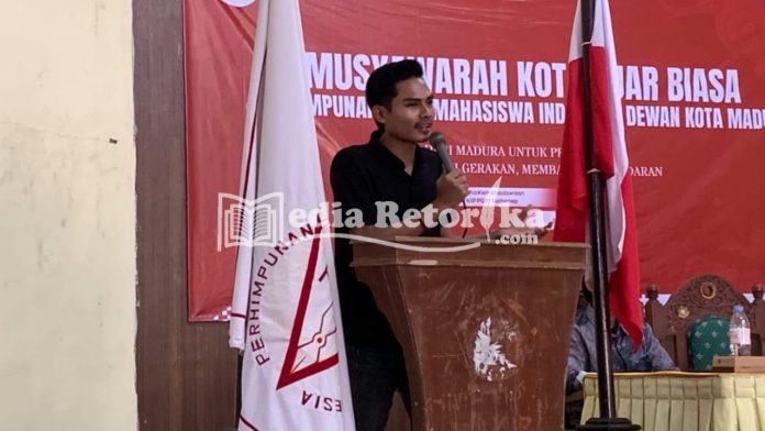 Potret Presiden Badan Eksekutif Mahasiswa UPI Sumenep Moh Nurul Hidayatullah saat memberikan sambutan (Arsip Mediaretorika.com)
